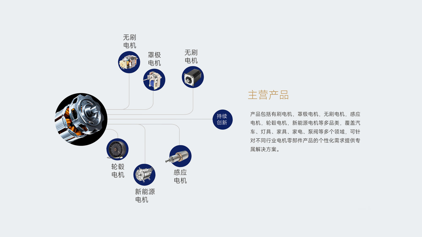 主營產品:刷電機,罩極電機,無刷電機,感應電機,輪毅電機,新能源電機等多品類,覆蓋汽車、燈具、家具、家電、泵閥等多個領域,可針對不同行業電機零部件產品的個性化需求提供專屬解決方案。