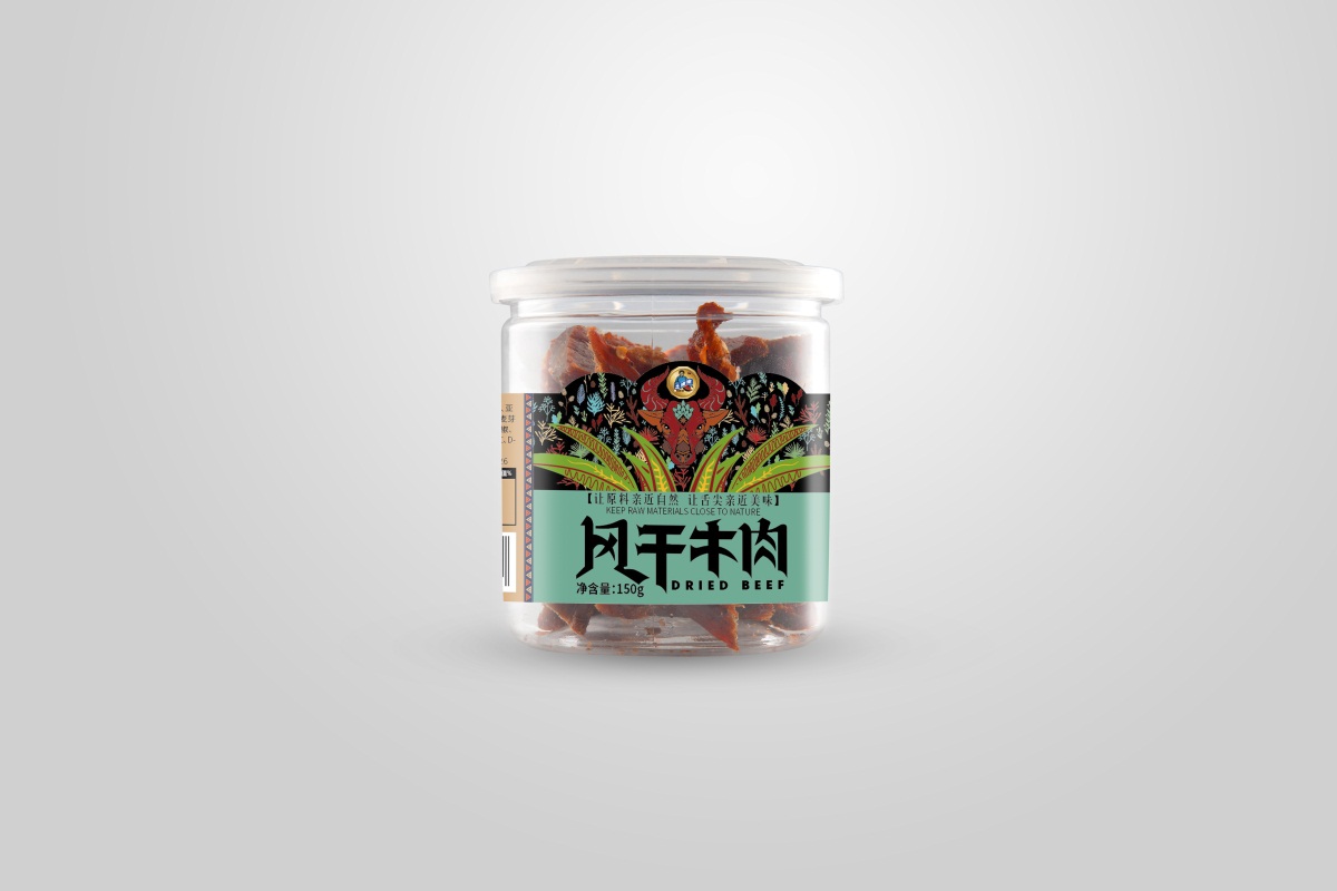 用牦牛肉腌制風干而成的肉干,牛肉干含有人體所需的多種礦物質和氨基酸,既保持了牛肉耐咀嚼的風味,又久存不變質。這款封干牛肉包裝有三個尺寸規格,以筒裝形式為主加標簽設計的形式來呈現,標簽將藏族特色文化元素進行插畫設計,品名字體也根據地方特色進行字體創作,突顯地方特色文化和美食文化,同時又打破傳統的配色,采用比較現代高級的低飽和度色彩為主,以現代休閑食品的風格,拉進與消費者的距離。